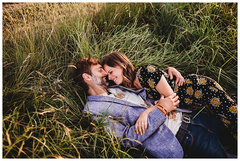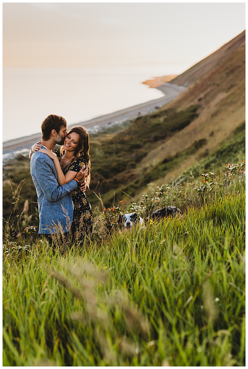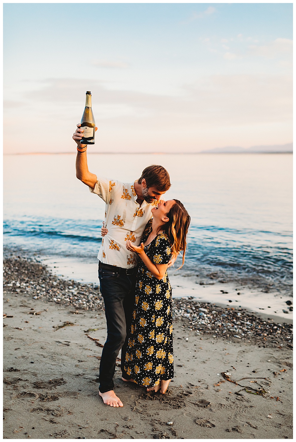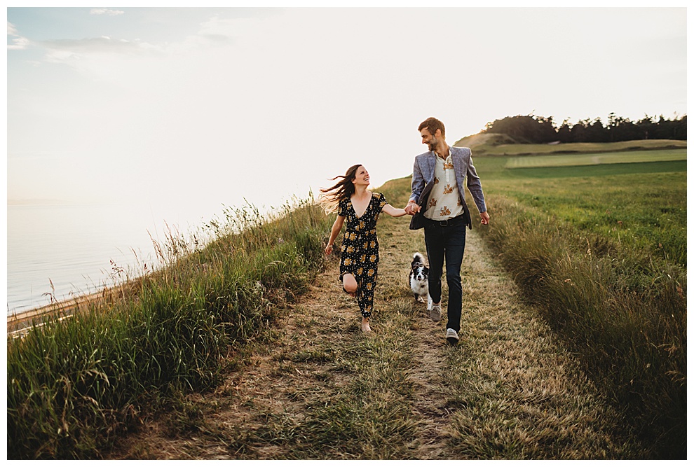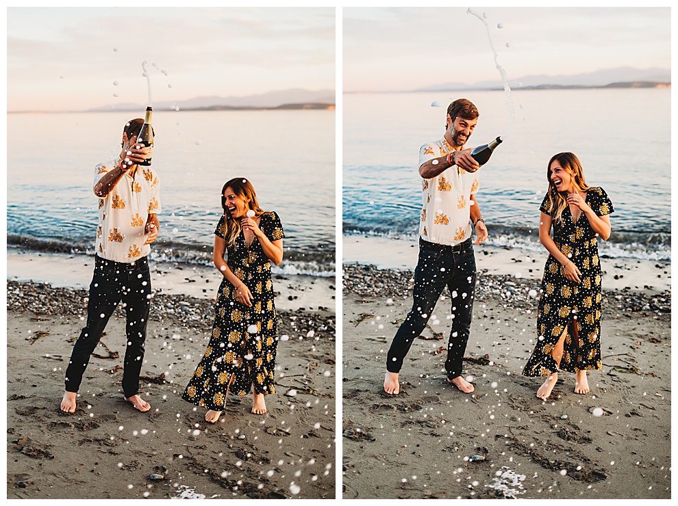We started off the session by walking along the beach, exploring and laughing while I took photos. Jenna + Nabil have the cutest dog, who was super sweet and more than happy to splash around in the water. The light was amazing and they were so relaxed and fun! They tried out some couples yoga poses on the sand, ran when I asked them to, danced in the grass, and just laughed and had a blast the entire time we were together. Nabil popped some champagne – which is my favorite way to celebrate an engagement session! – and their faces were priceless.