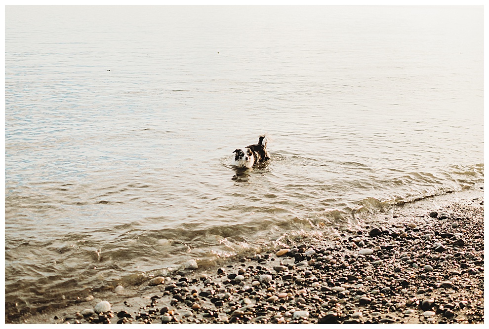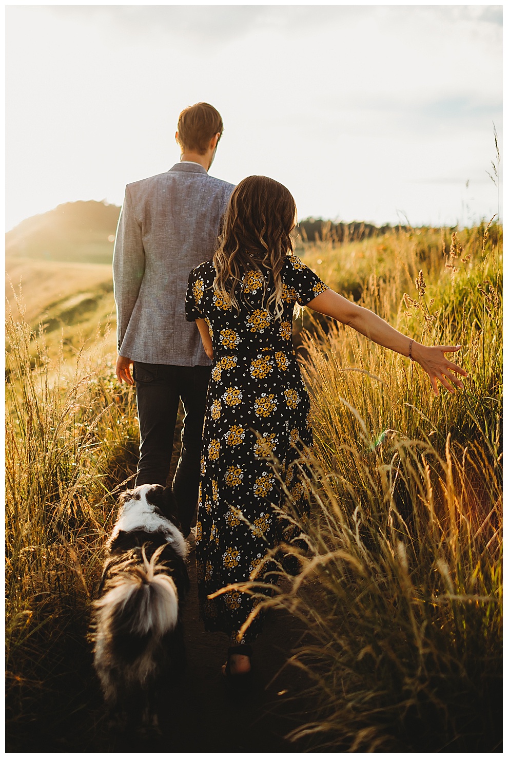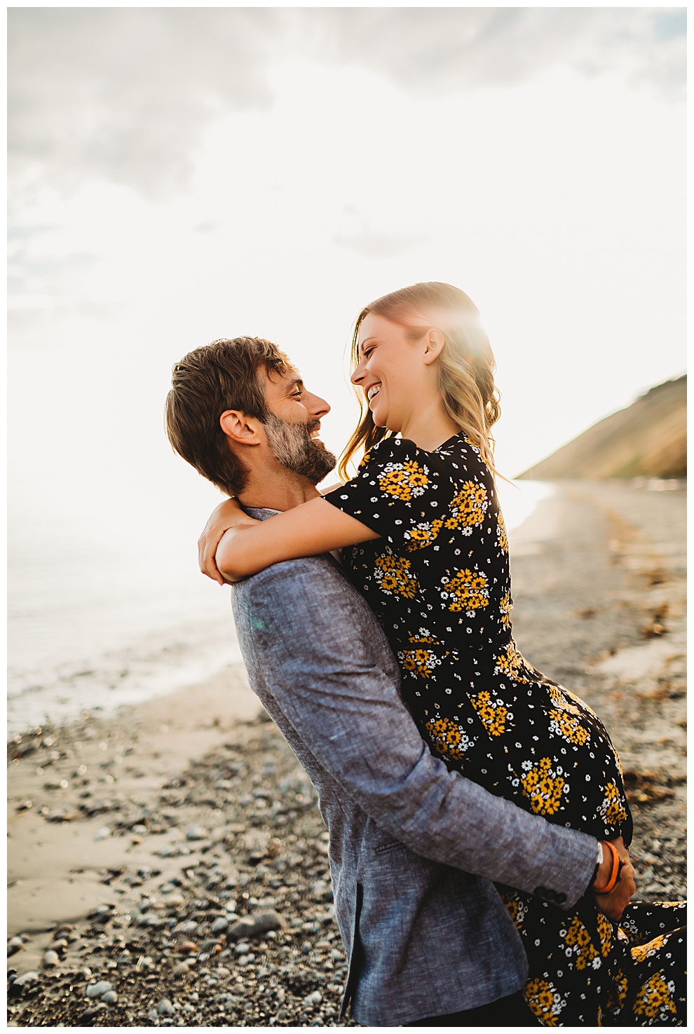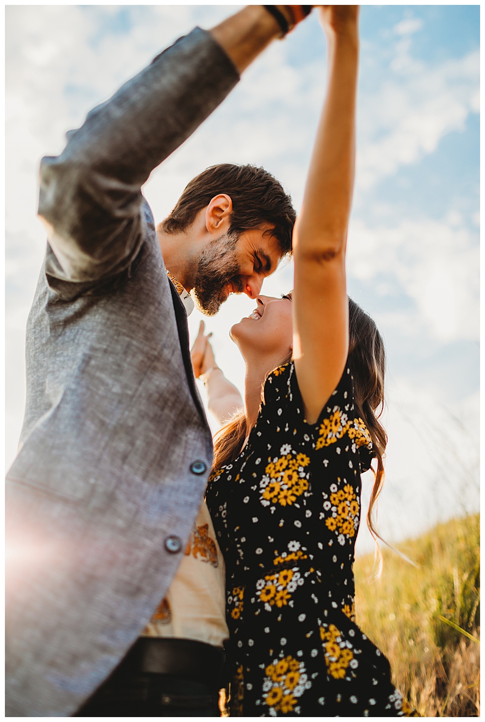We started off the session by walking along the beach, exploring and laughing while I took photos. Jenna + Nabil have the cutest dog, who was super sweet and more than happy to splash around in the water. The light was amazing and they were so relaxed and fun! They tried out some couples yoga poses on the sand, ran when I asked them to, danced in the grass, and just laughed and had a blast the entire time we were together. Nabil popped some champagne – which is my favorite way to celebrate an engagement session! – and their faces were priceless.