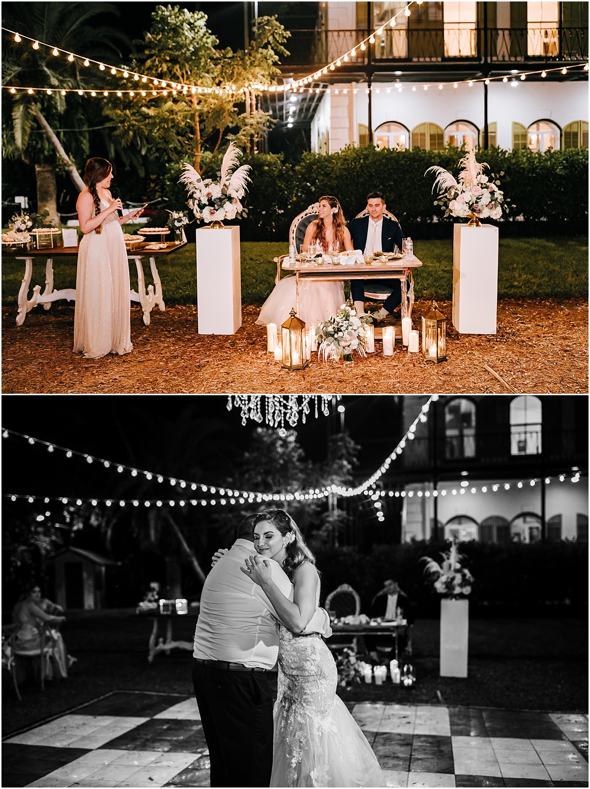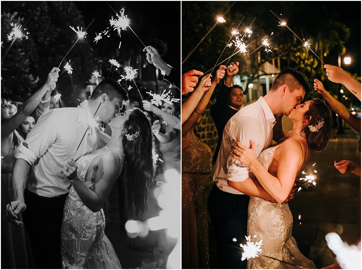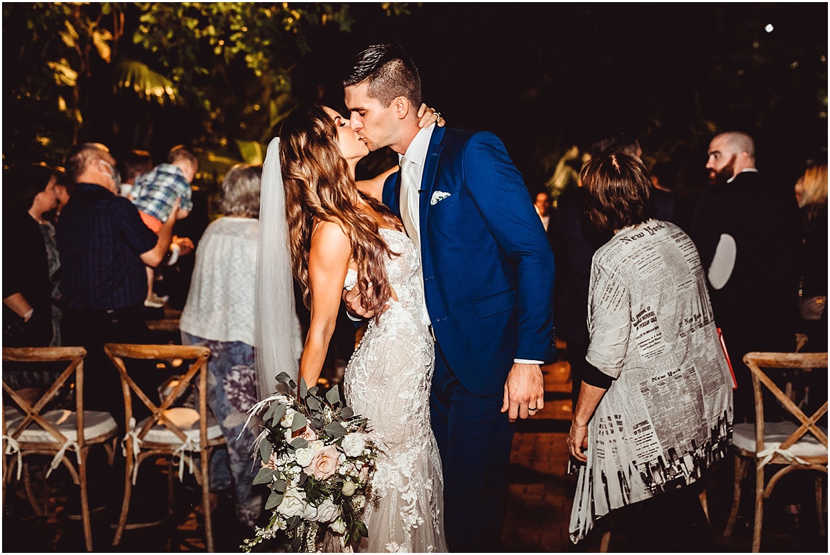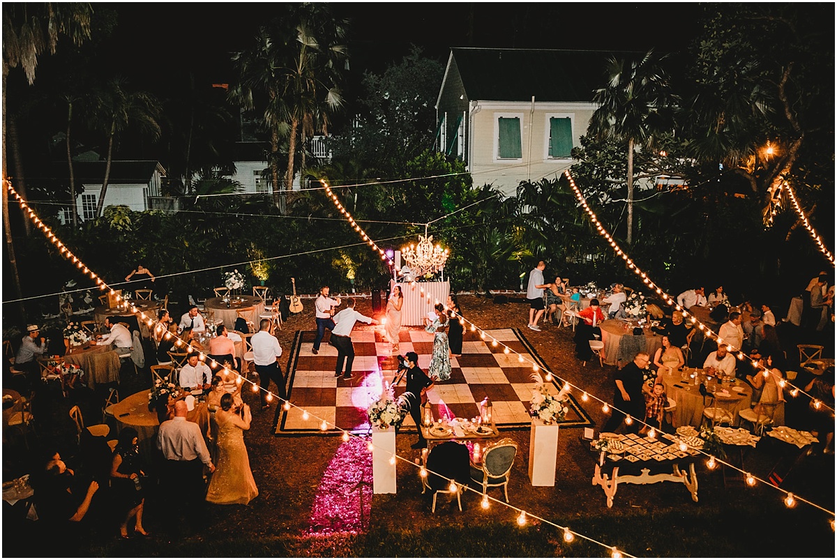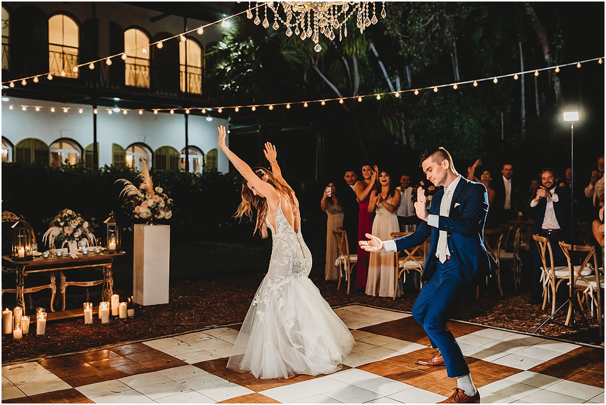 They had a nighttime ceremony at the Hemmingway House and truly a beautiful evening with their closest friends and family. The whole ceremony was gorgeous and just really sweet. The reception area had a huge chandelier and bistro lights. Savannah had a beautiful vision for what she wanted. And she brought it to life with Destination Wedding Studio her coordinator. Her words were she wanted the vision to be romantic and vintage all the garden feels. She loves the Addison bistro lights and wanted to incorporate the romantic lighting in the photos as well as the chandelier. It was very neutral and gold antique vintage looking. Absolutely stunning in every way. Everyone partied the night away and had an amazing night. They then ended the night with a super fun sparkler exit!