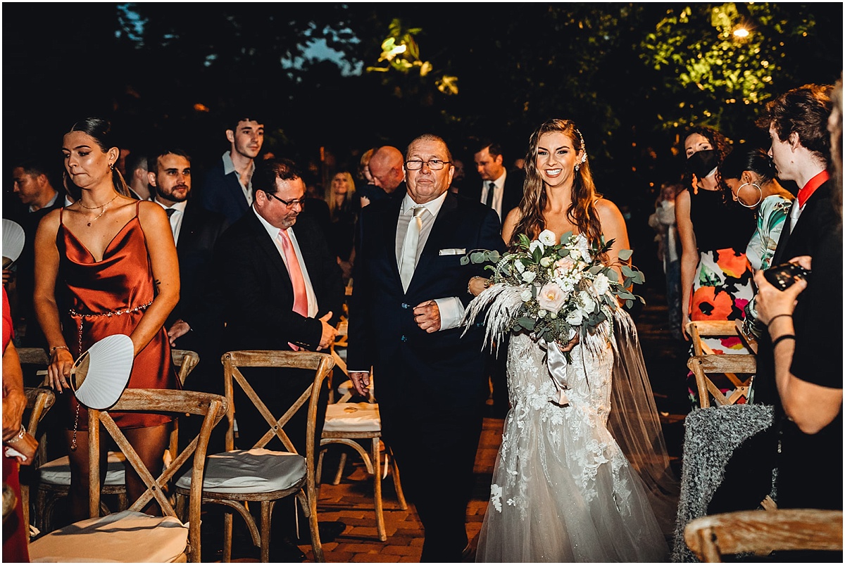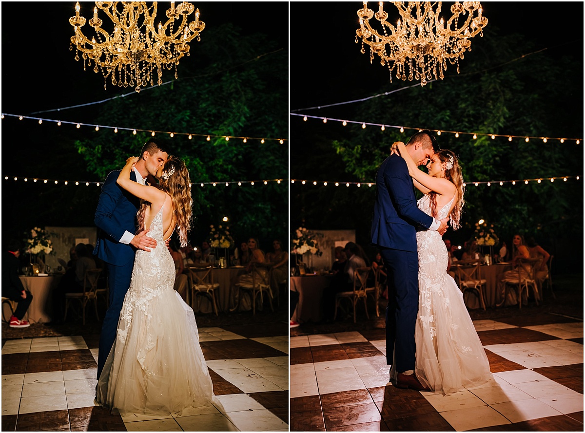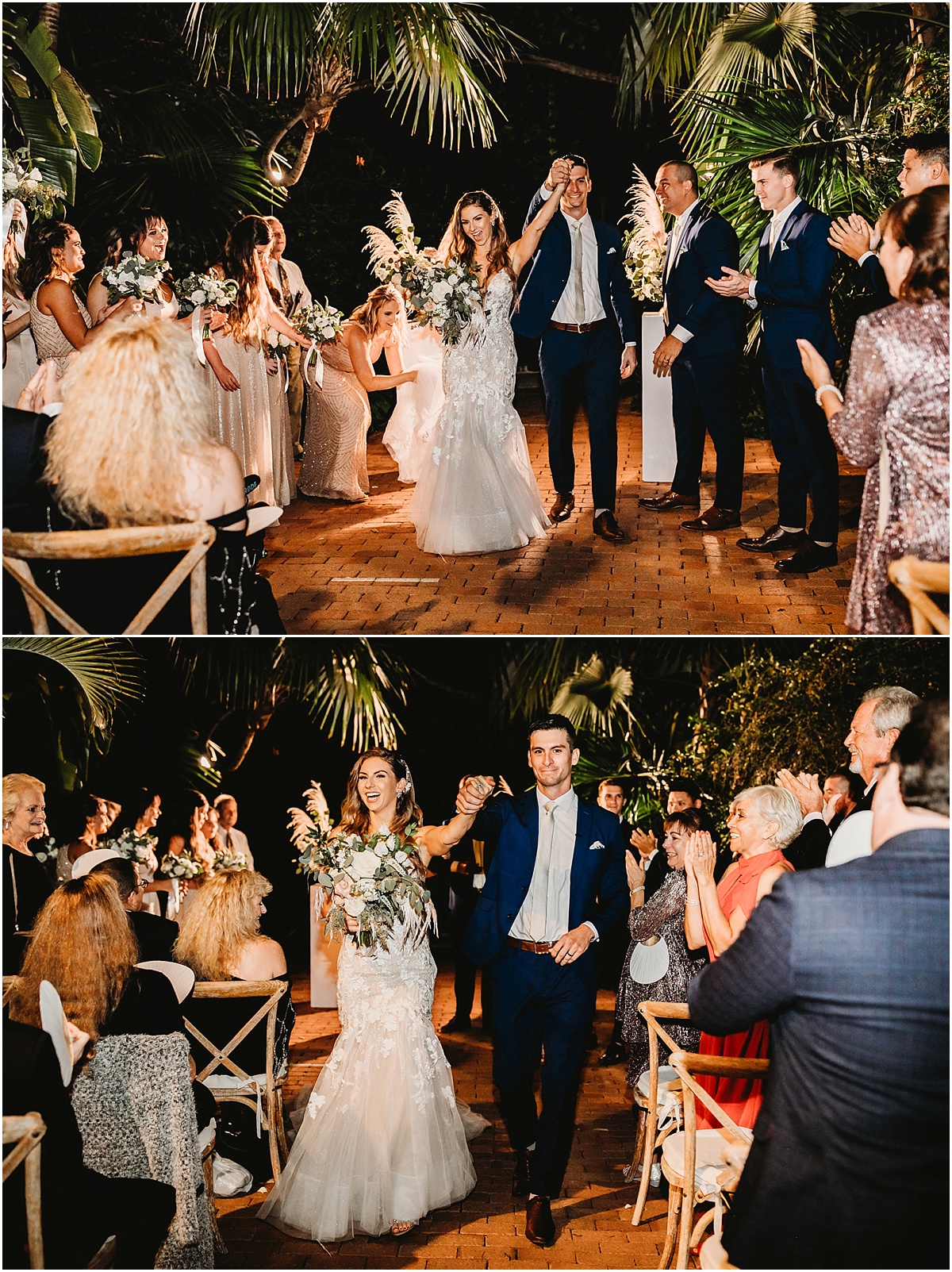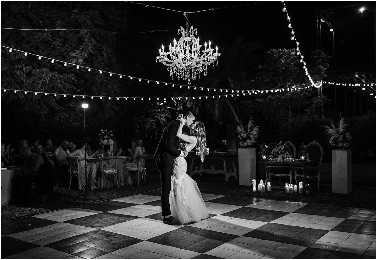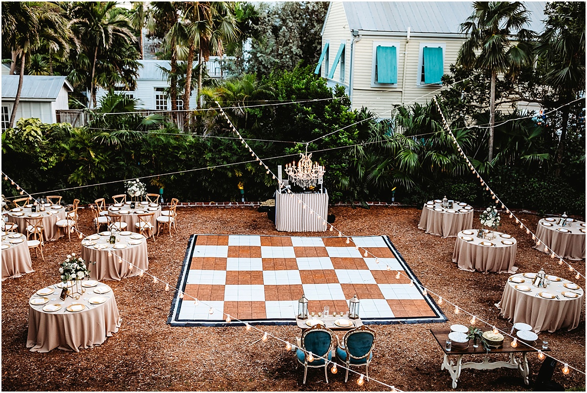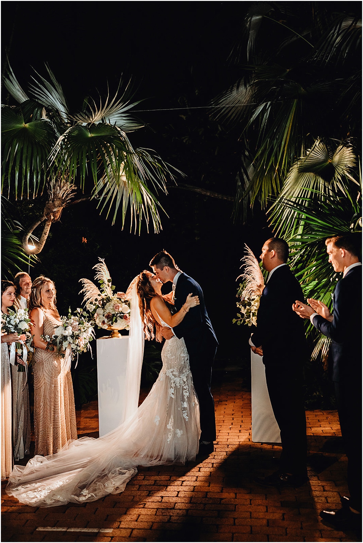 They had a nighttime ceremony at the Hemmingway House and truly a beautiful evening with their closest friends and family. The whole ceremony was gorgeous and just really sweet. The reception area had a huge chandelier and bistro lights. Savannah had a beautiful vision for what she wanted. And she brought it to life with Destination Wedding Studio her coordinator. Her words were she wanted the vision to be romantic and vintage all the garden feels. She loves the Addison bistro lights and wanted to incorporate the romantic lighting in the photos as well as the chandelier. It was very neutral and gold antique vintage looking. Absolutely stunning in every way. Everyone partied the night away and had an amazing night. They then ended the night with a super fun sparkler exit!
