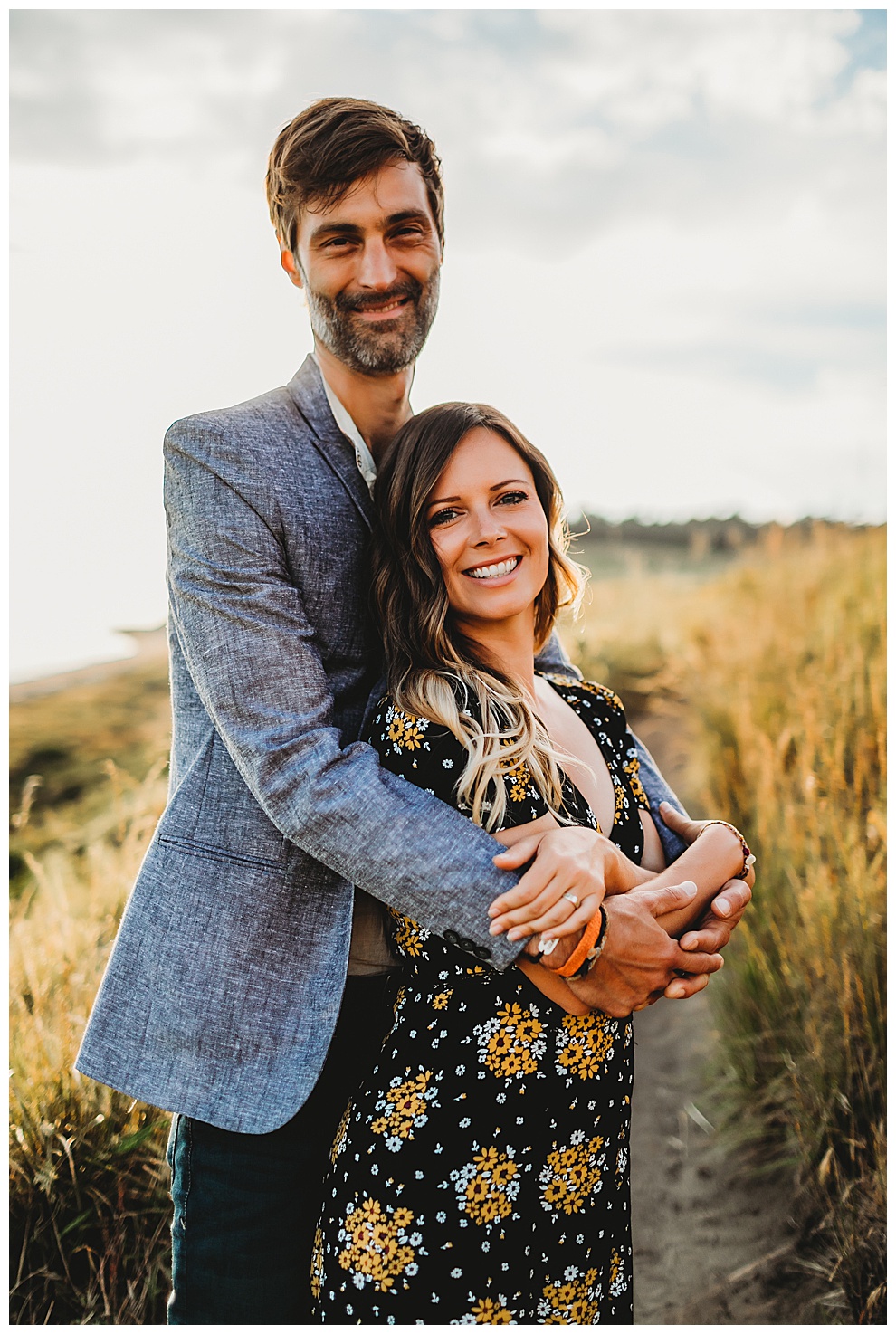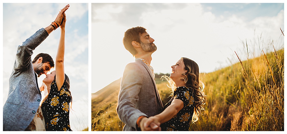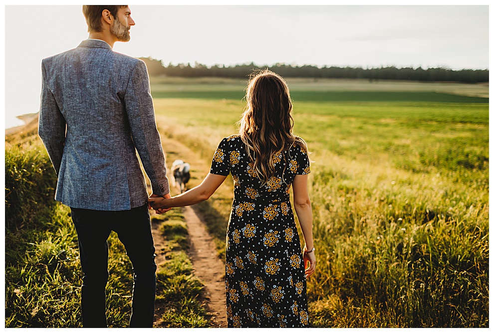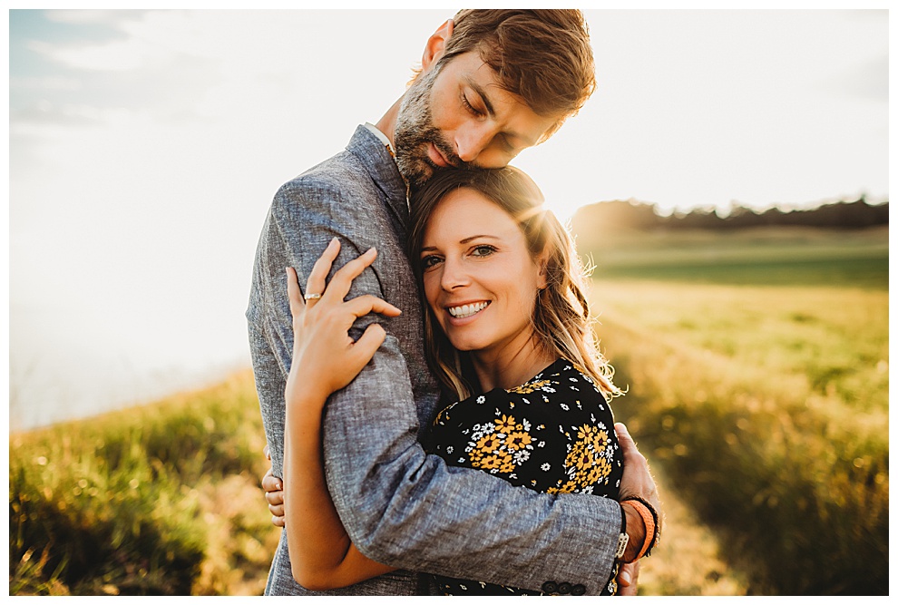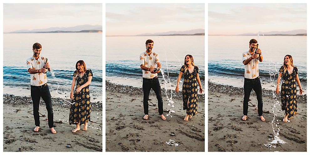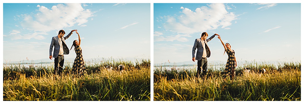 We started off the session by walking along the beach, exploring and laughing while I took photos. Jenna + Nabil have the cutest dog, who was super sweet and more than happy to splash around in the water. The light was amazing and they were so relaxed and fun! They tried out some couples yoga poses on the sand, ran when I asked them to, danced in the grass, and just laughed and had a blast the entire time we were together. Nabil popped some champagne – which is my favorite way to celebrate an engagement session! – and their faces were priceless.