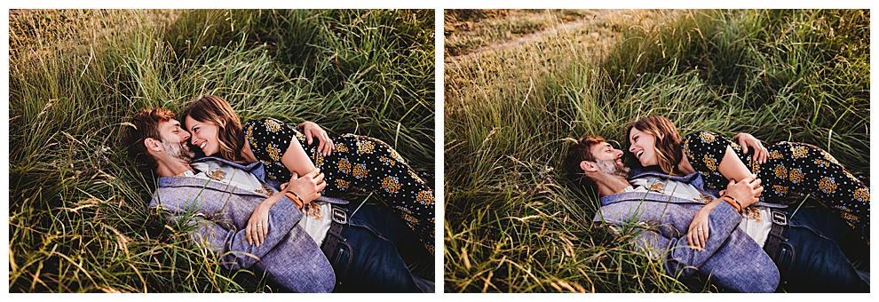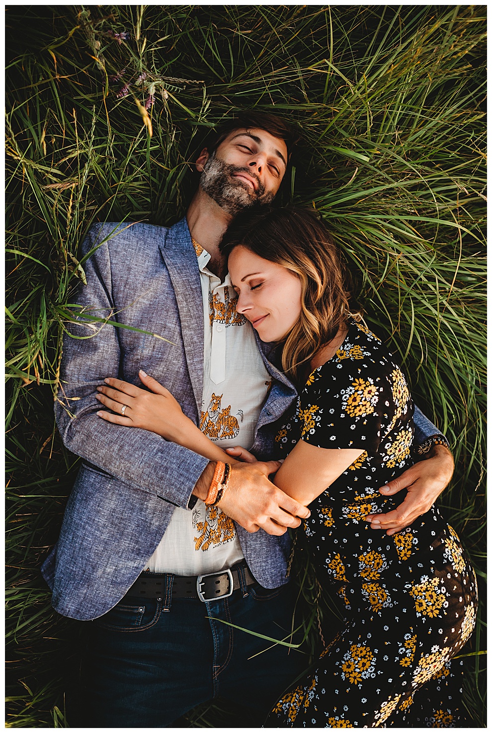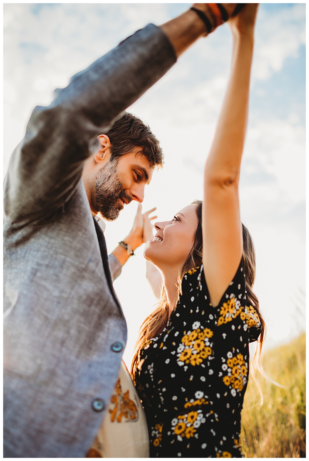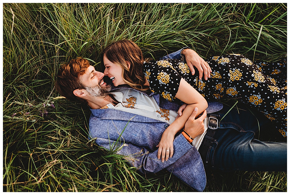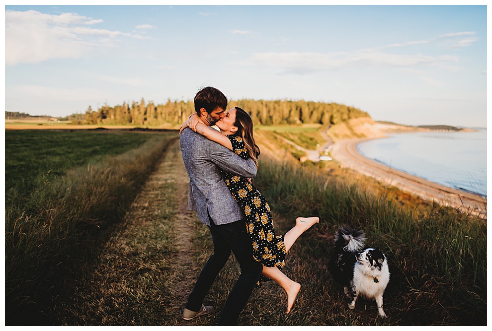 We started off the session by walking along the beach, exploring and laughing while I took photos. Jenna + Nabil have the cutest dog, who was super sweet and more than happy to splash around in the water. The light was amazing and they were so relaxed and fun! They tried out some couples yoga poses on the sand, ran when I asked them to, danced in the grass, and just laughed and had a blast the entire time we were together. Nabil popped some champagne – which is my favorite way to celebrate an engagement session! – and their faces were priceless.