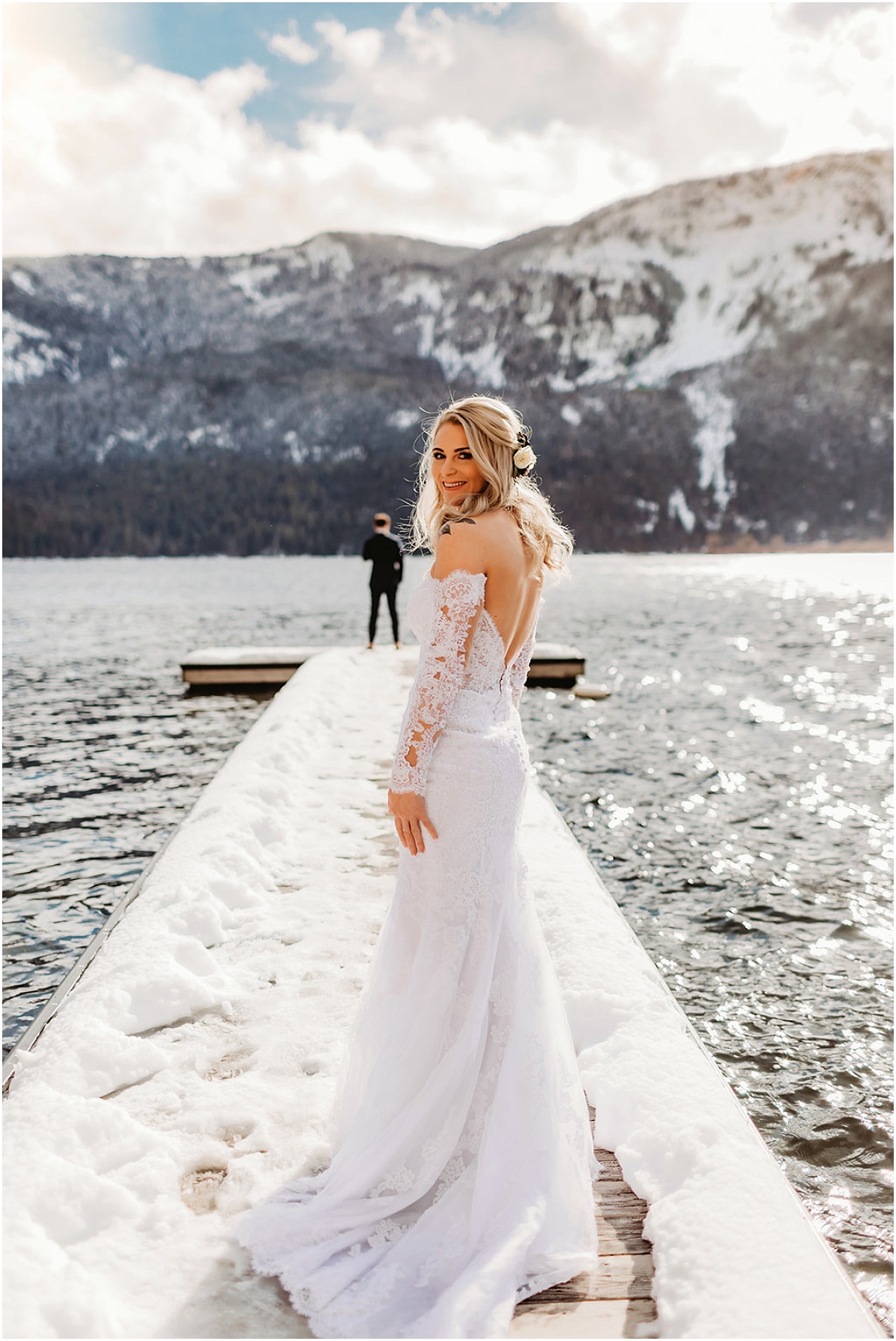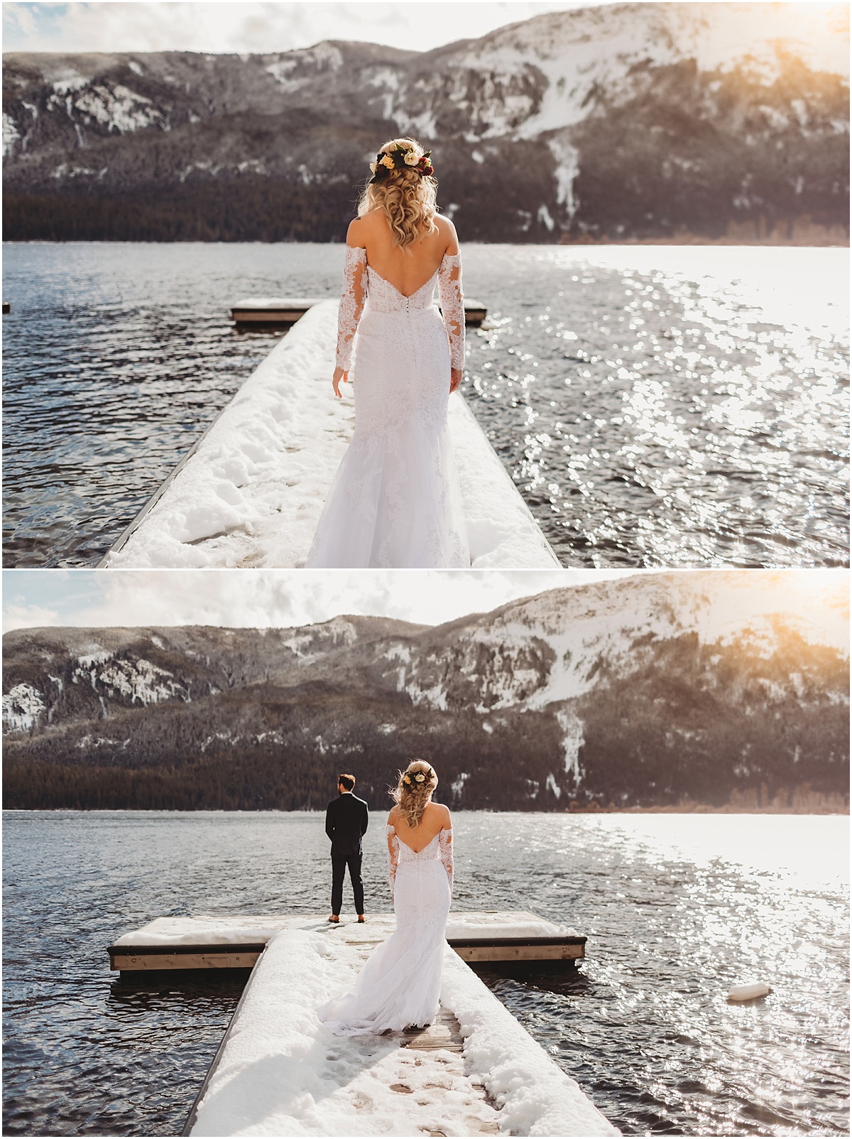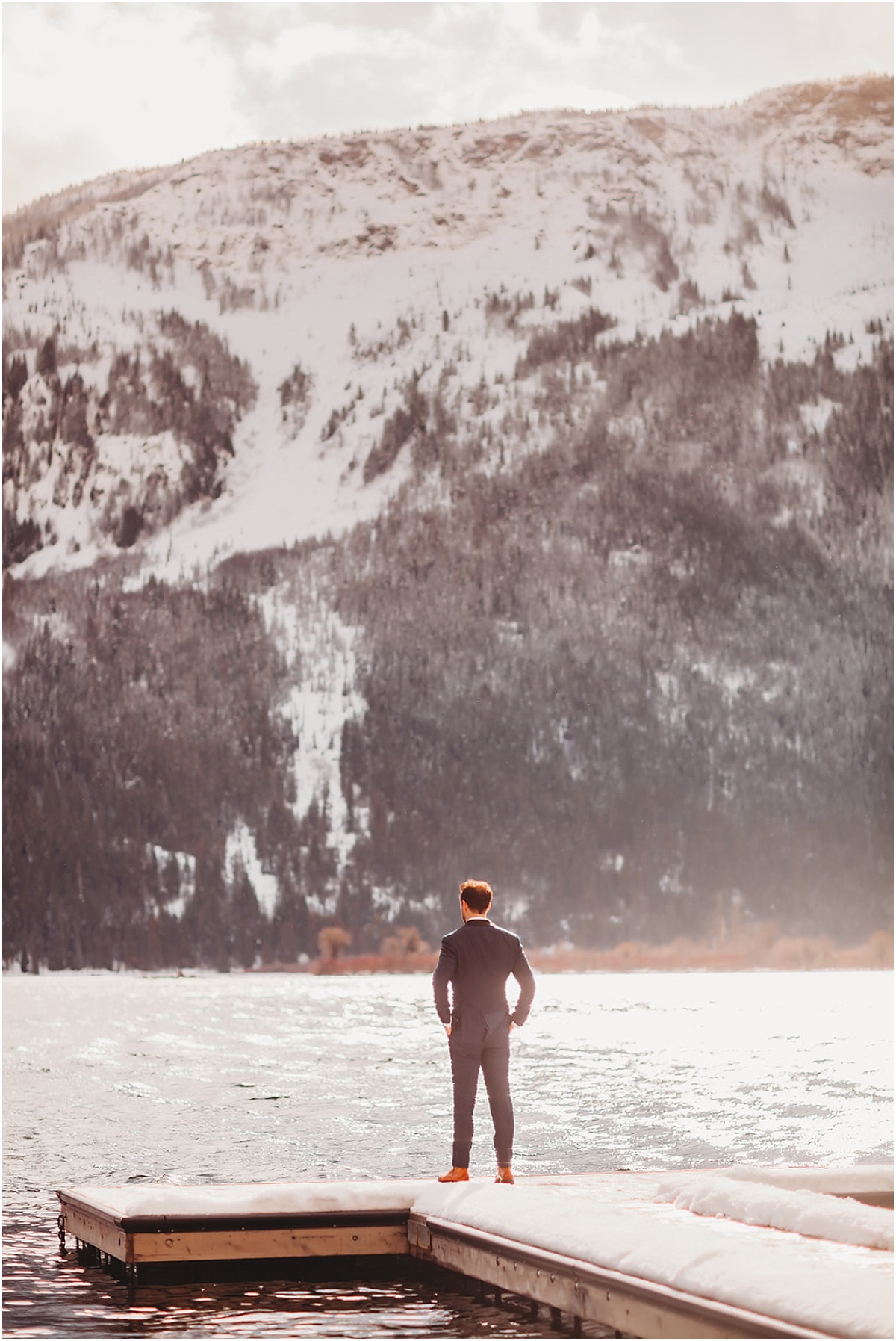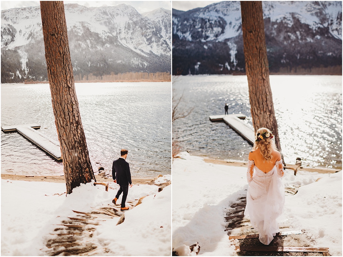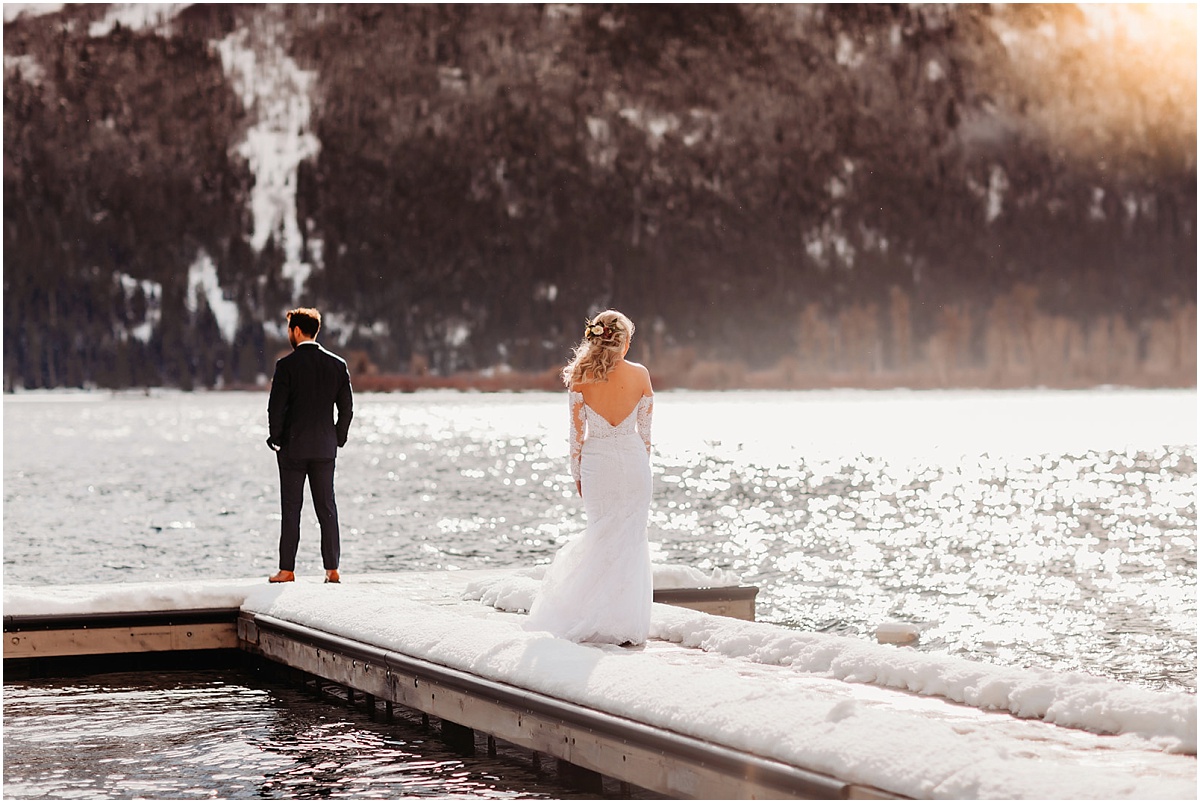 The first look took place on a little peer overlooking Lake Wenatchee. The little dock leading out to the lake was stunning. The way the lightning was hitting everything was freaking gorgeous. These winter wedding portraits are some of my favorite portraits.