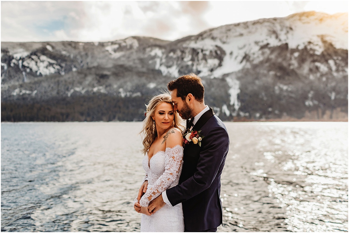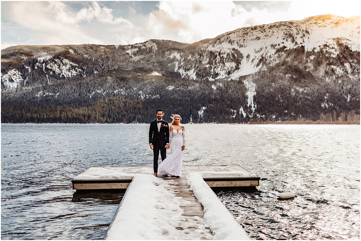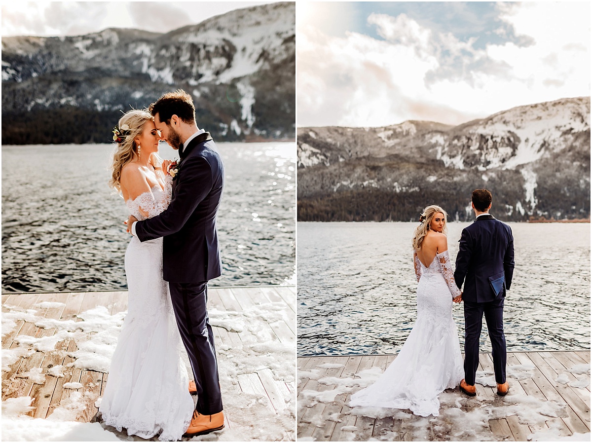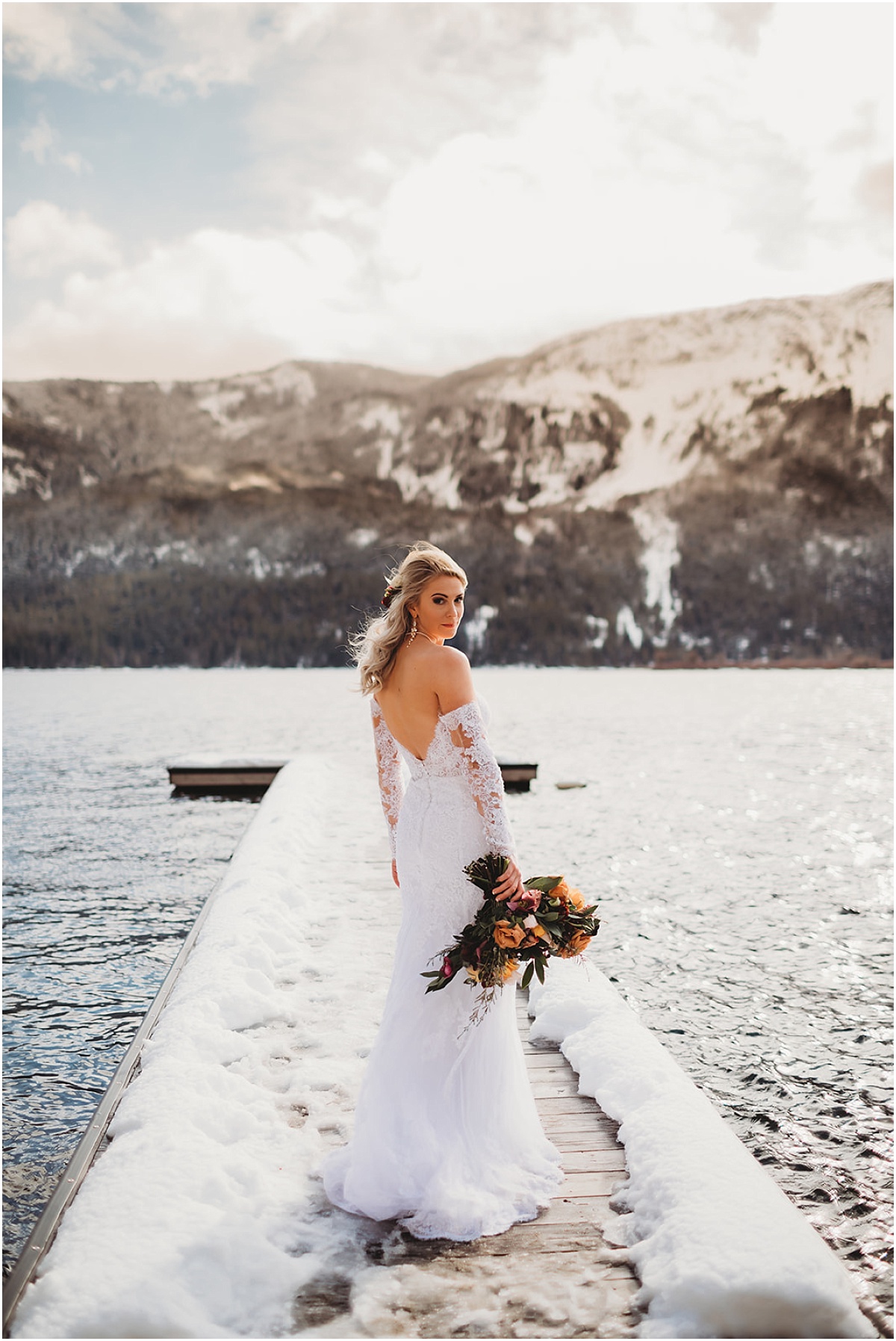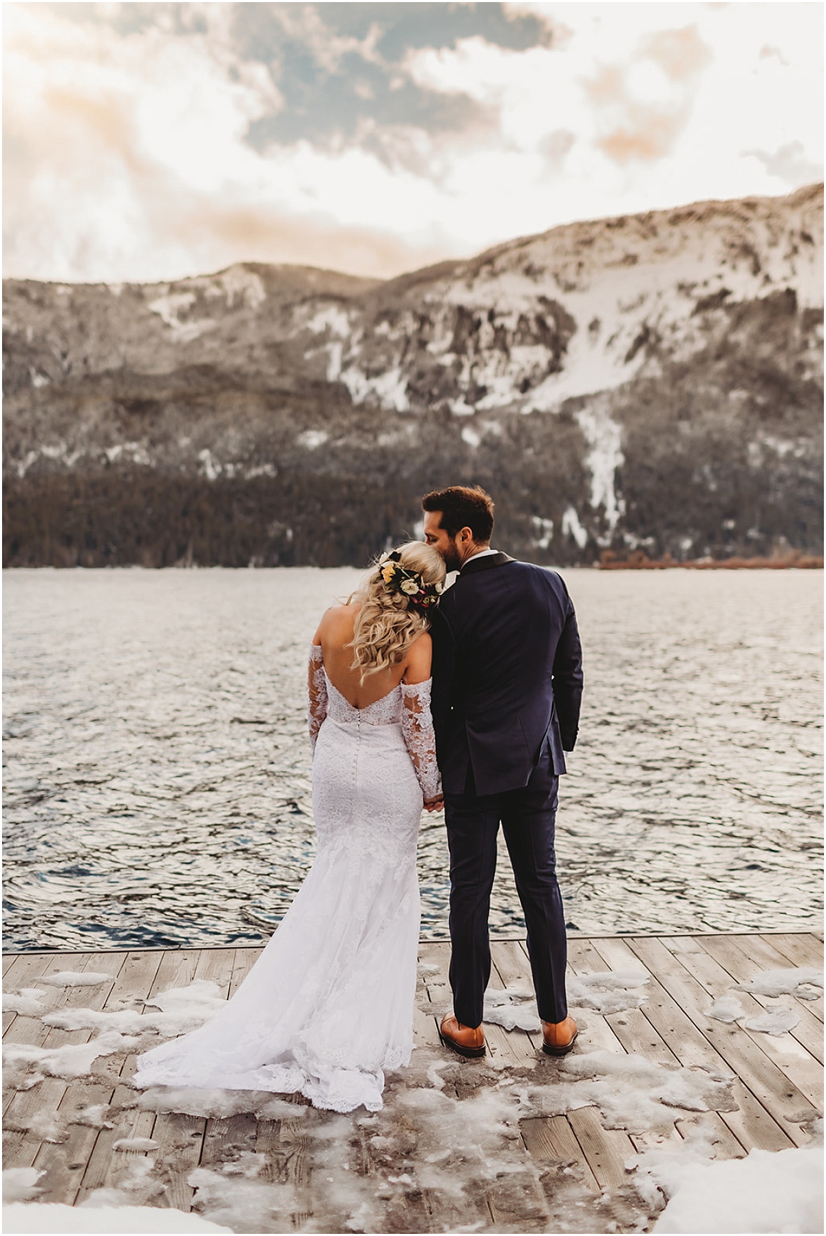 The first look took place on a little peer overlooking Lake Wenatchee. The little dock leading out to the lake was stunning. The way the lightning was hitting everything was freaking gorgeous. These winter wedding portraits are some of my favorite portraits.