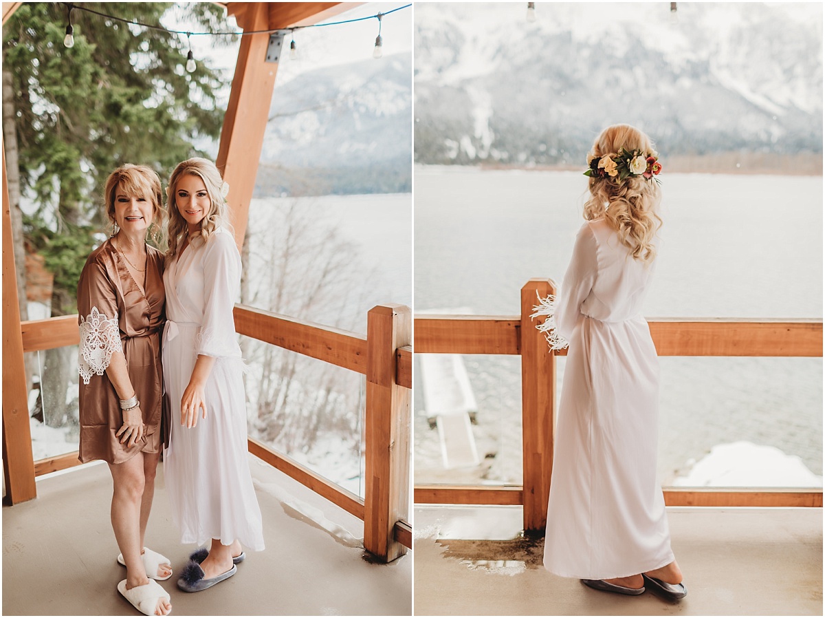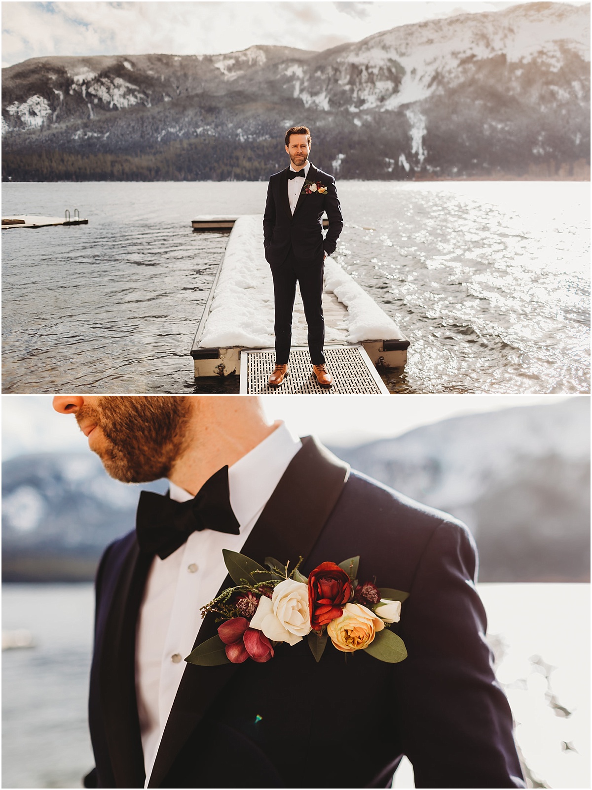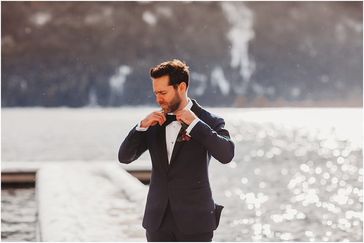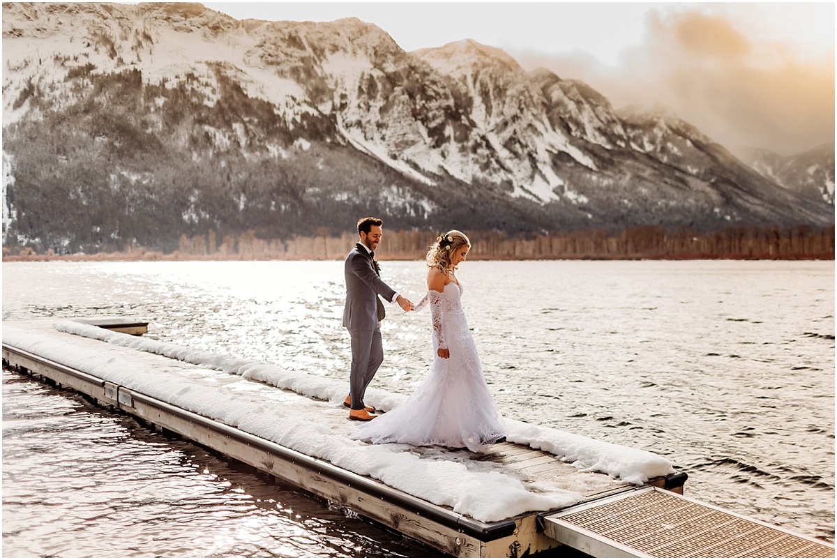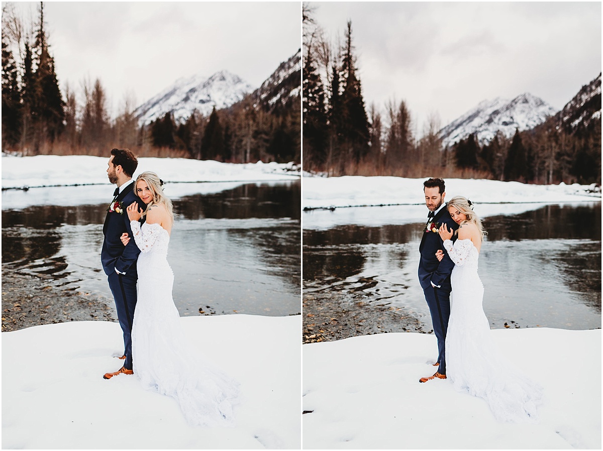 The first look took place on a little peer overlooking Lake Wenatchee. The little dock leading out to the lake was stunning. The way the lightning was hitting everything was freaking gorgeous. These winter wedding portraits are some of my favorite portraits.
