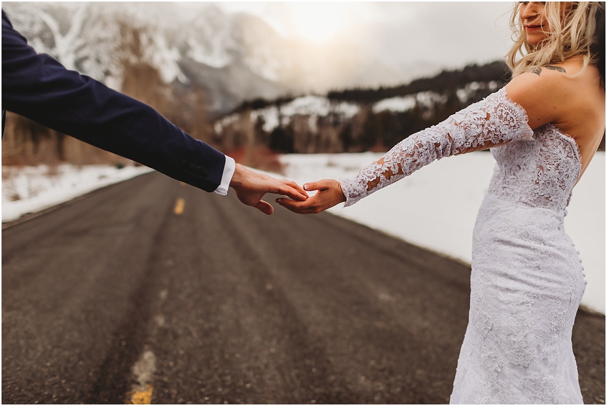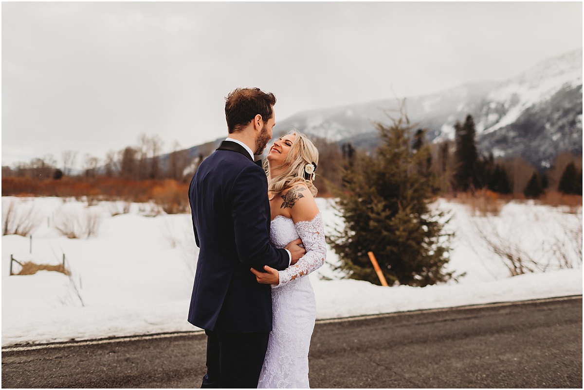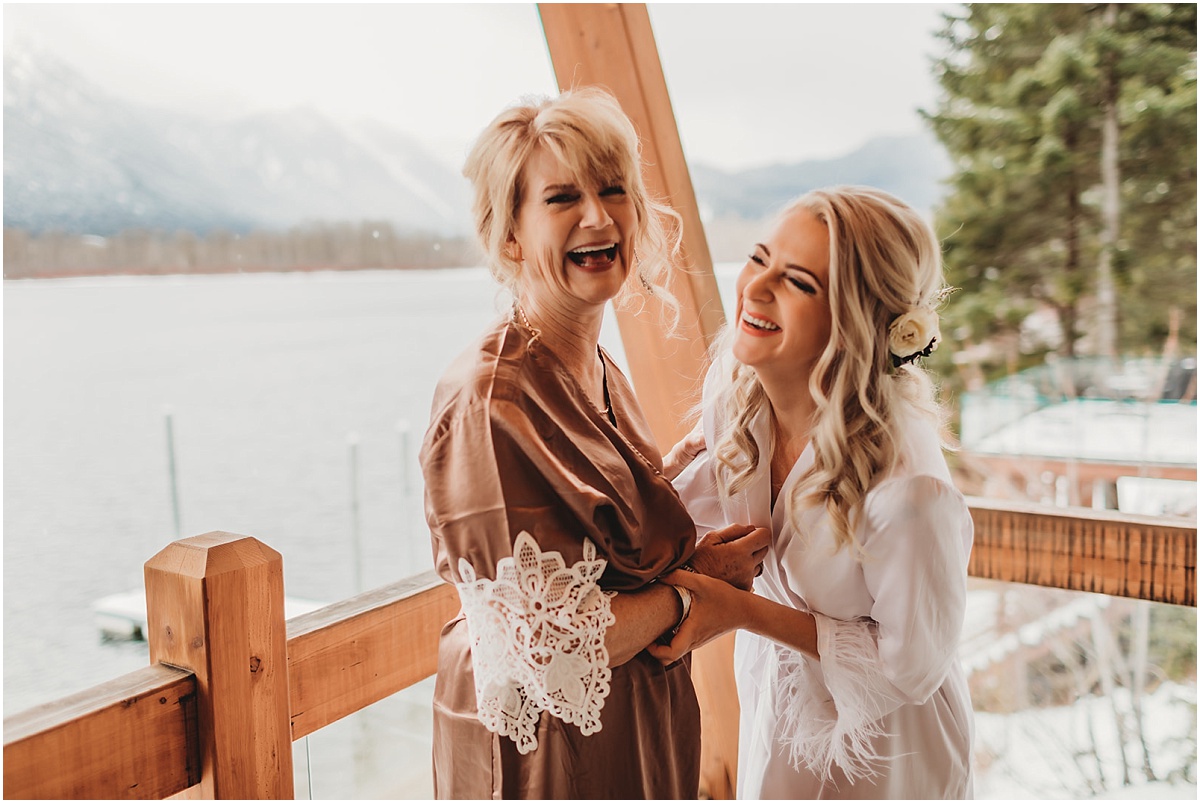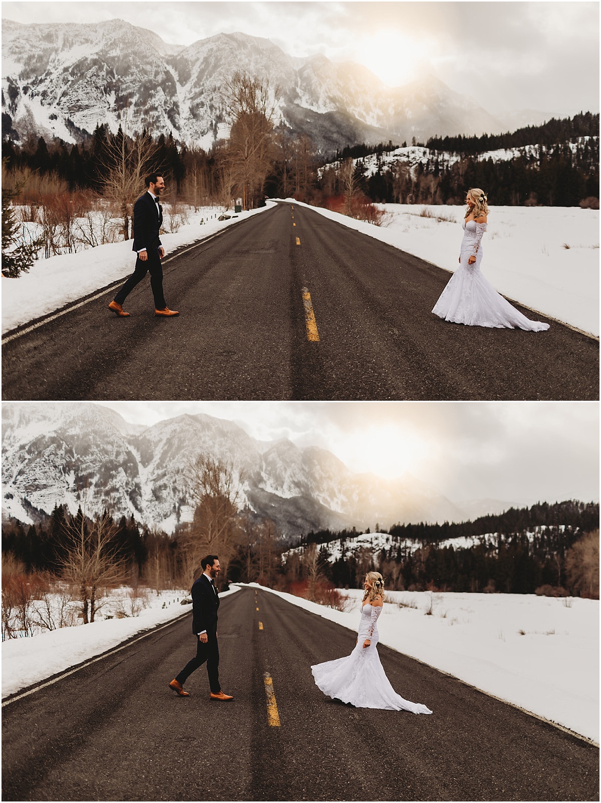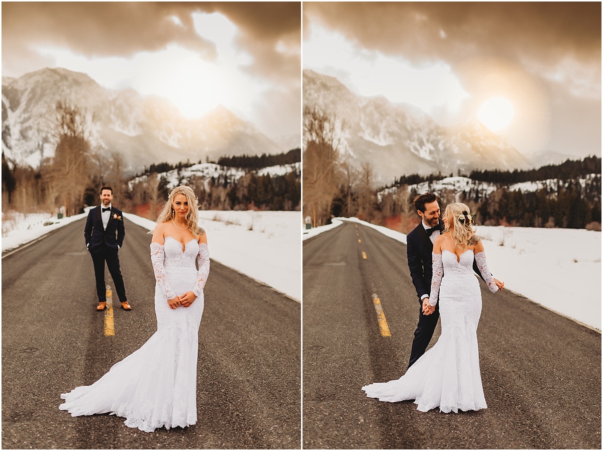 The first look took place on a little peer overlooking Lake Wenatchee. The little dock leading out to the lake was stunning. The way the lightning was hitting everything was freaking gorgeous. These winter wedding portraits are some of my favorite portraits.