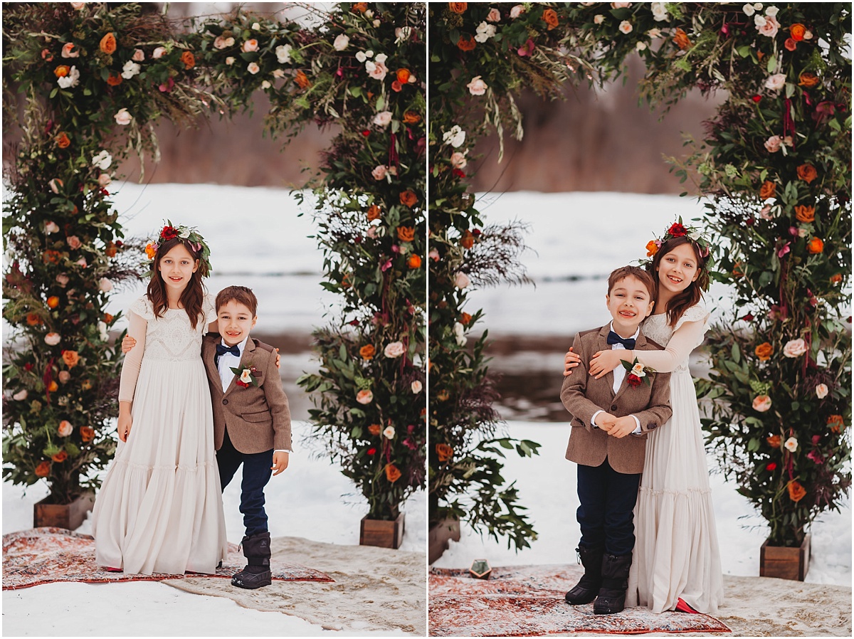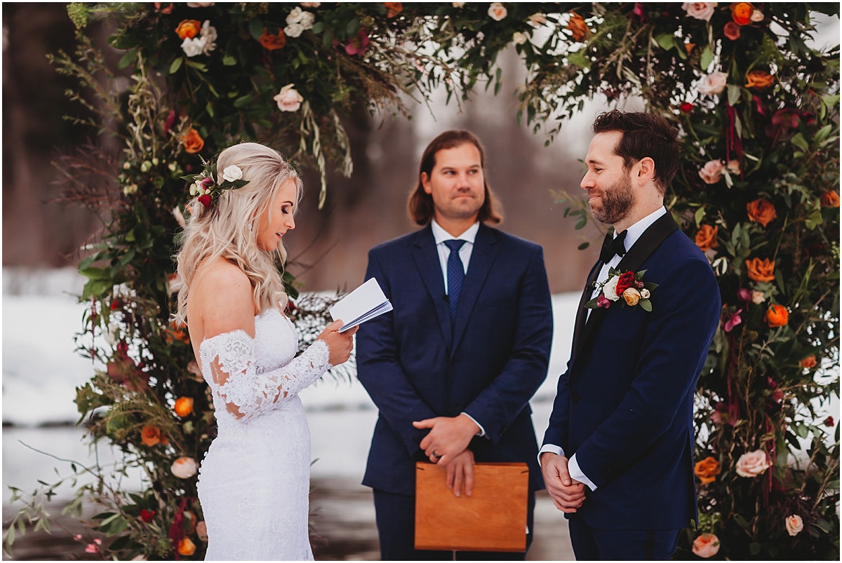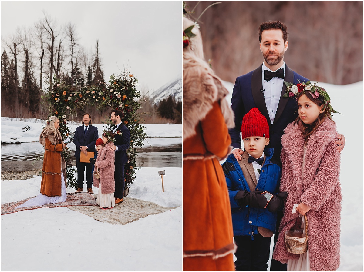 The ring bearer and flower girl were Patrick’s kiddos. They got to be a part of this special day and it was so sweet to watch. Becca’s father was very adamant about carrying the ax while walking her down the aisle to give to Patrick as part of handing his daughter off. As well as starting a fire to warm everyone up and signal a beautiful ceremony. During the ceremony, they ready their beautiful vows to each other. Then Becca read vows to the children, and it brought everyone to tears.